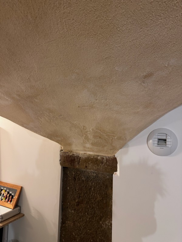 Les murs ont été repris avec un enduit neuf il y a une dizaine d’années, mais aujourd’hui, à Vienne Isère, les taux d’humidité restent très élevés, avec des remontées visibles jusqu’à 1 mètre. La maison, utilisée de manière saisonnière, est équipée de déshumidificateurs et bacs de récupération, améliorant légèrement le confort sans traiter la cause structurelle.
